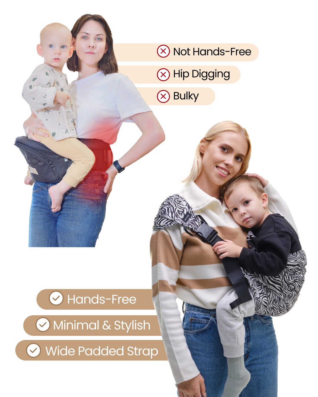 Hip carriers put 100% of your toddler's weight into your lower back which will cause serious strain after a few uses