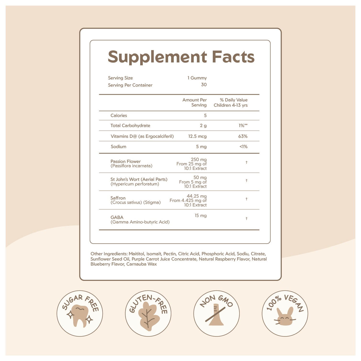 30 delicious mood-support gummies packed with Saffron, Passionflower, GABA, and other natural ingredients to help support your little one’s emotional balance and calm.