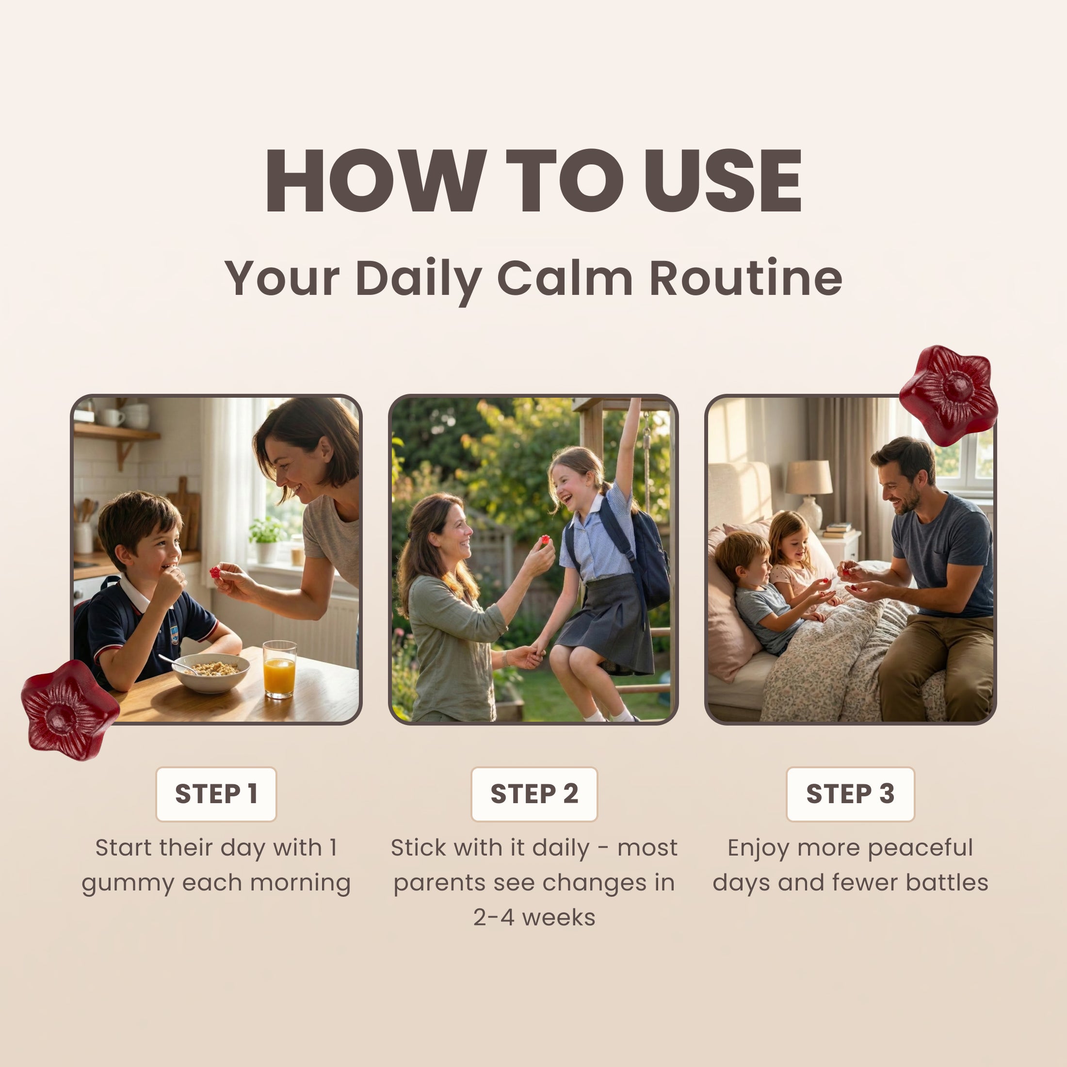 This is when most parents notice a real difference. Meltdowns become less frequent and less intense. Focus at school starts to improve — some parents even report fewer calls from teachers. Mornings feel less like a battlefield. Your child may seem more like "themselves" — the version you always knew was in there. This is also when kids often start asking for their gummy without being reminded.